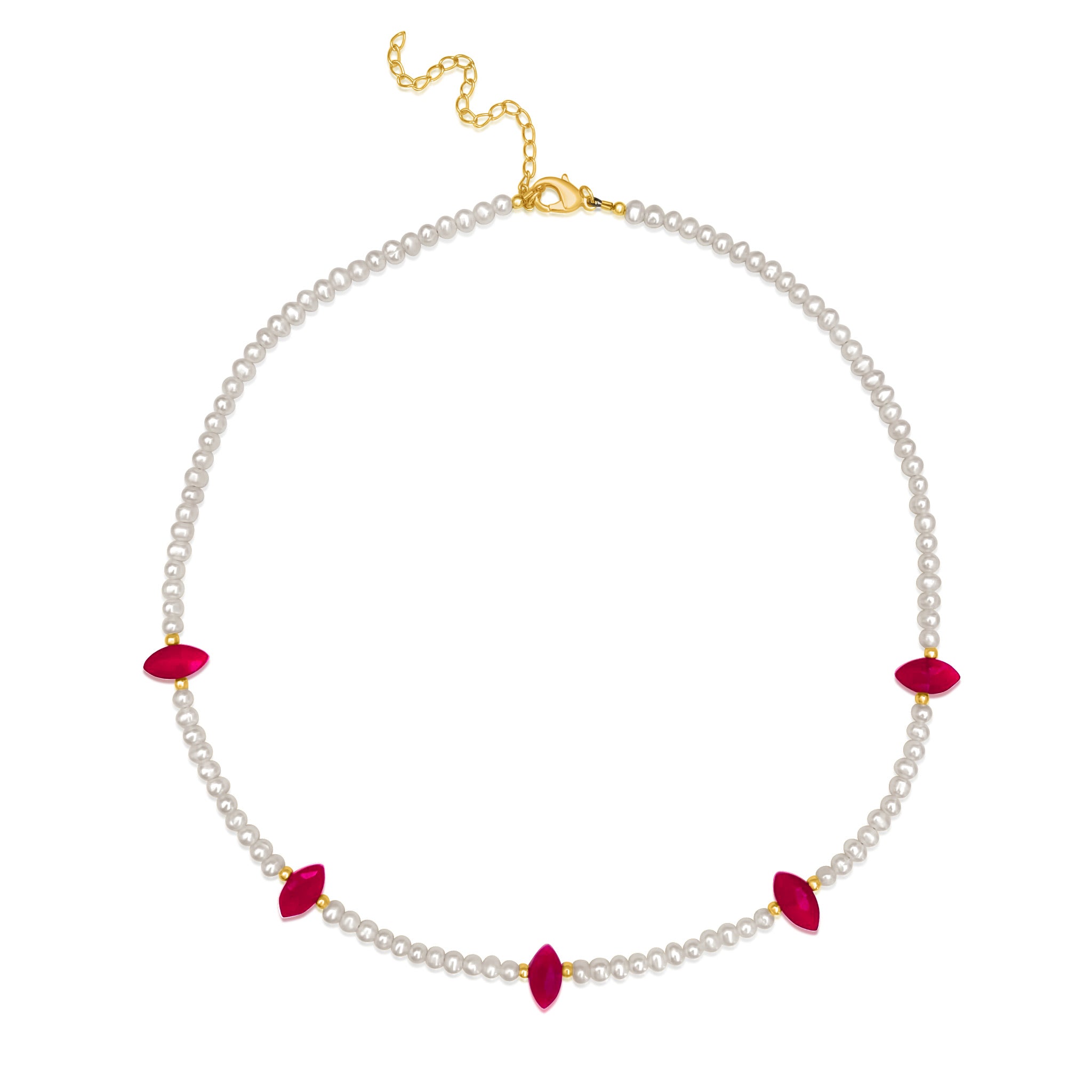 This choker is a statement piece to have. It has the perfect amount of glitz and is delicate enough to wear day to night. The freshwater pearl adds softness and glow, while the magenta chalcedony stones add a pop of color without being too flashy.