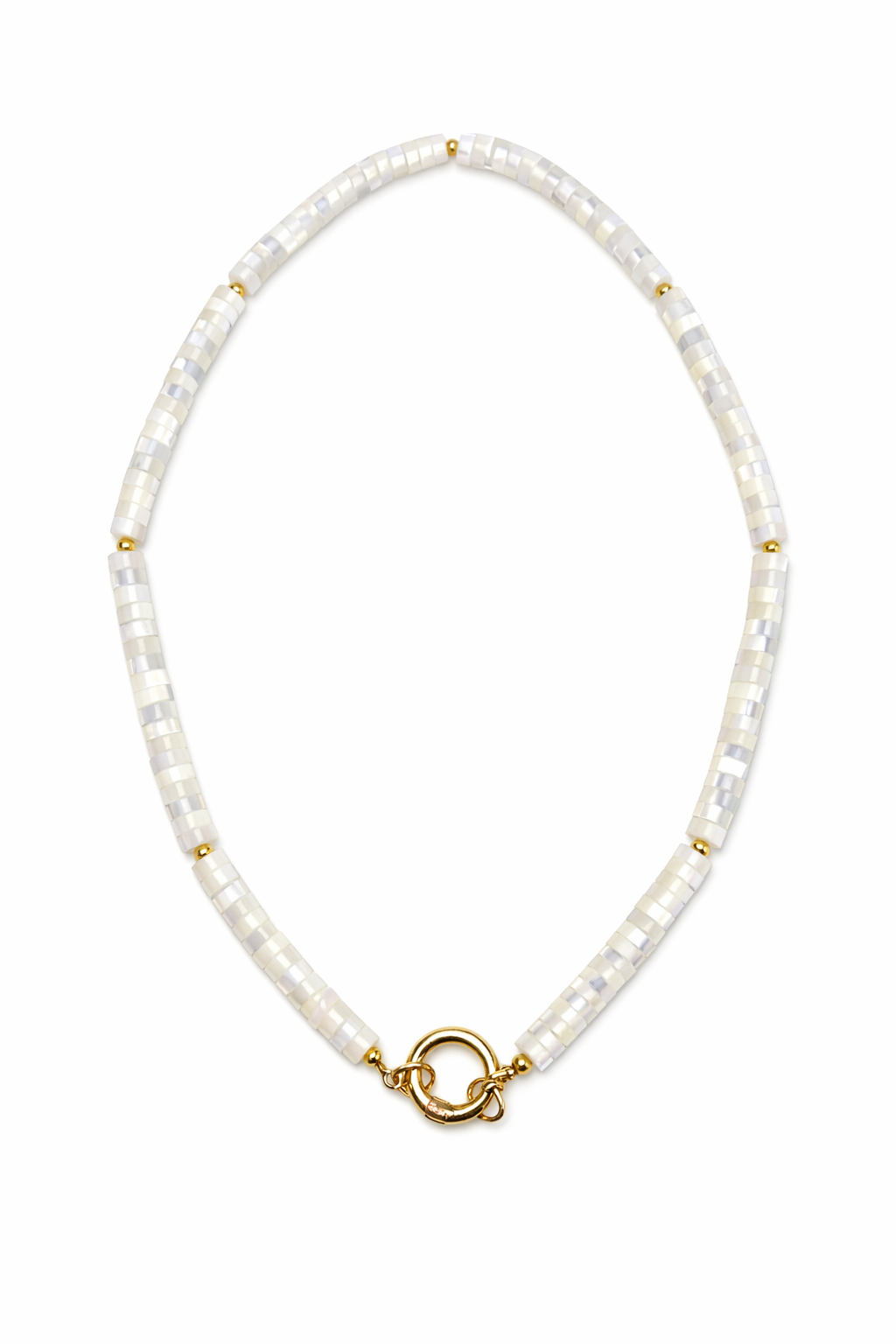 Luminous mother of pearl catches the light with every movement, creating an iridescent glow that complements any complexion. This elegant necklace features genuine shell inlay with natural color variations, making each piece uniquely beautiful. The smooth, polished stone sits gracefully against the skin, offering timeless sophistication for both everyday wear and special occasions. Perfect for layering or wearing solo, this versatile accessory brings understated luxury to your jewelry collection.