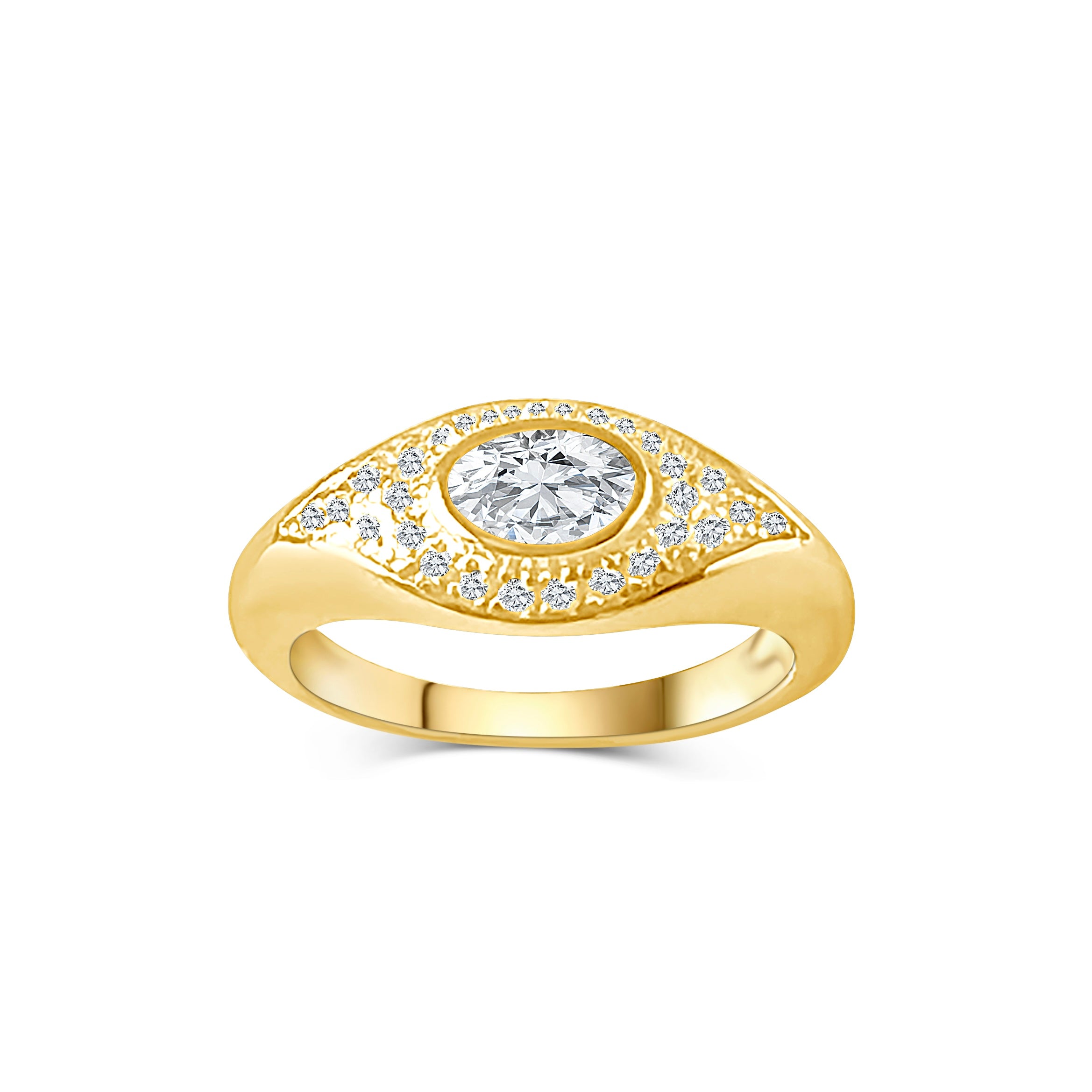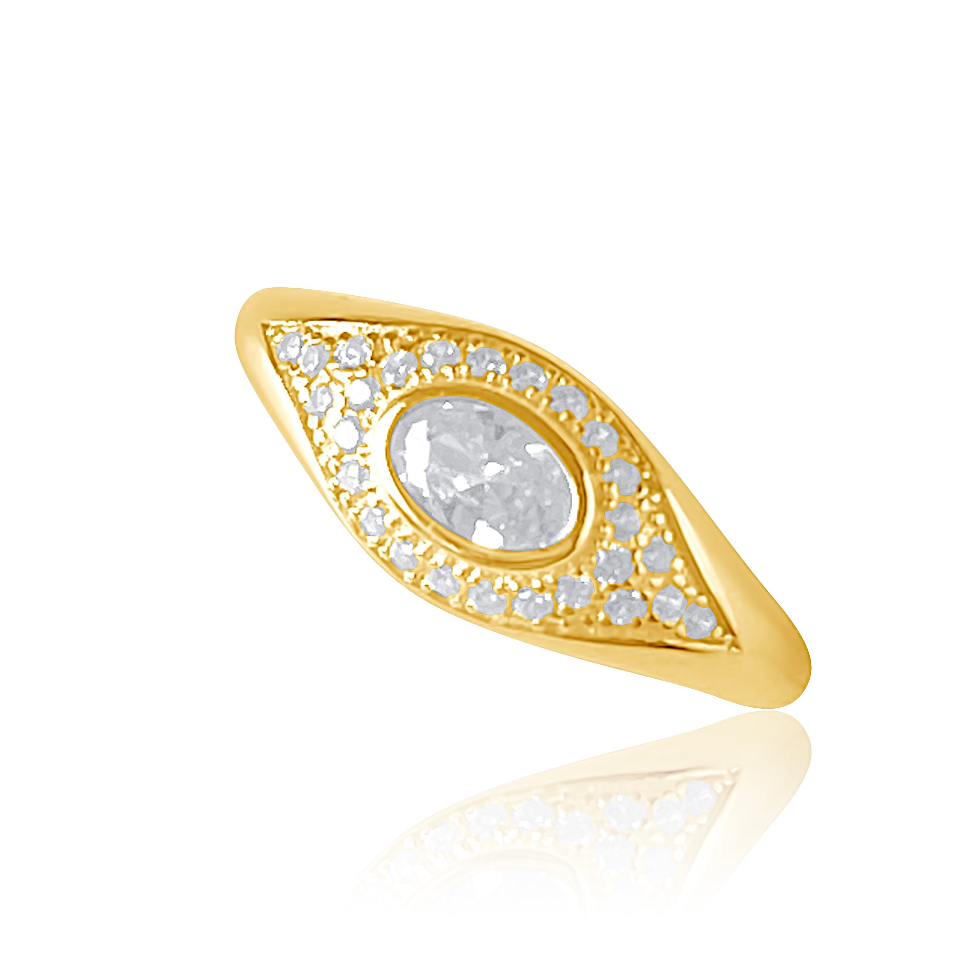 The beauty of this statement evil eye ring is that it can be as subtle or as extreme as you desire! We love this NADIA pavé evil eye ring because it gives you the best of both worlds. A zirconia center surrounded by white CZ encrusted stones is the core of this sparkling and sophisticated piece, featuring a remarkable amount of shine without being overbearing. It is all about balancing light and dark elements, so this ring offers an excellent opportunity to do just that!