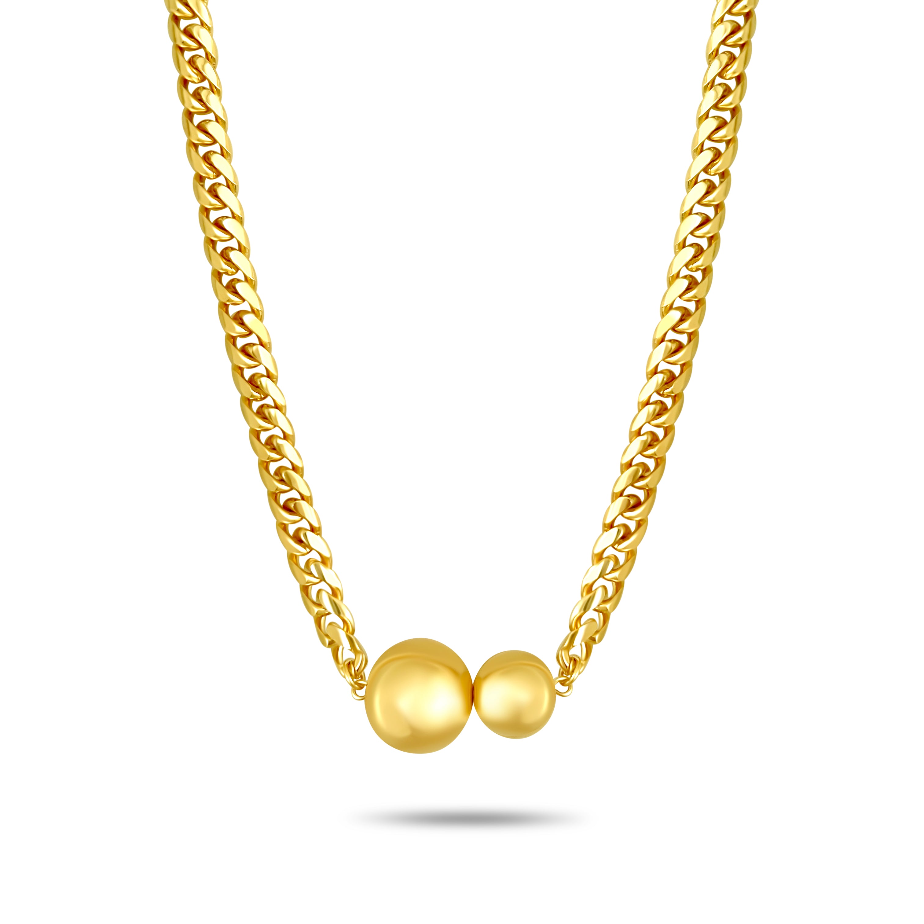 The AURELIE necklace commands attention with its striking dual-sphere design, crafted in the timeless Cuban link style. This sophisticated piece balances boldness with elegance, featuring two luminous spheres that catch light beautifully while the classic chain provides understated refinement. Perfect for those who appreciate statement jewelry that doesn't compromise on grace, this necklace elevates any ensemble with its distinctive silhouette and polished finish.