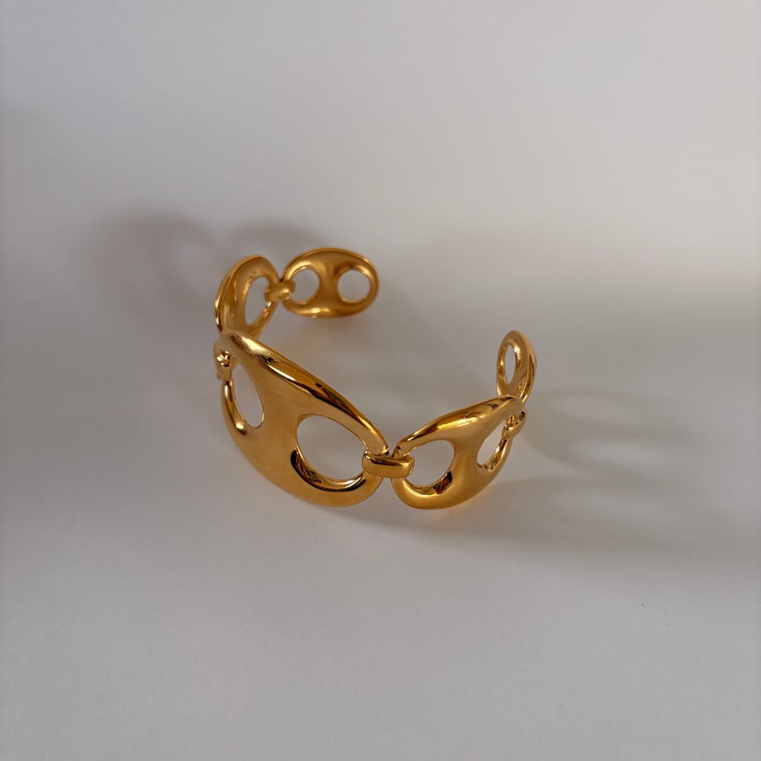 An open cuff bracelet with smooth cutout links and a high-polish gold finish. Striking yet refined, designed to elevate everyday styling.