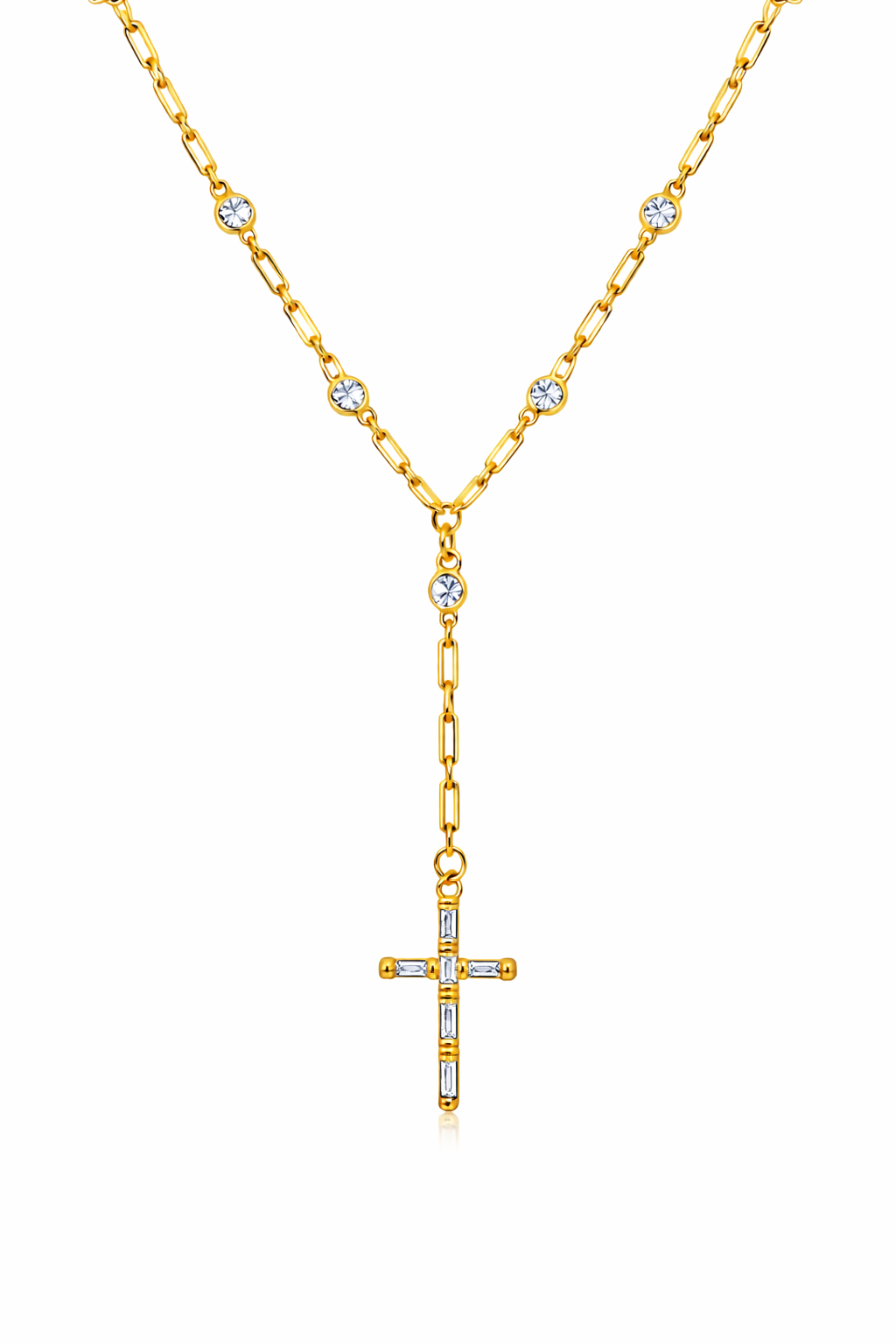 This LUCENT CROSS lariat necklace features delicate bezel-set zirconia along the chain, cascading into a refined Y-drop silhouette. The cross pendant is adorned with brilliant baguette and round zirconia stones, creating light from every angle while maintaining a timeless, minimal elegance.