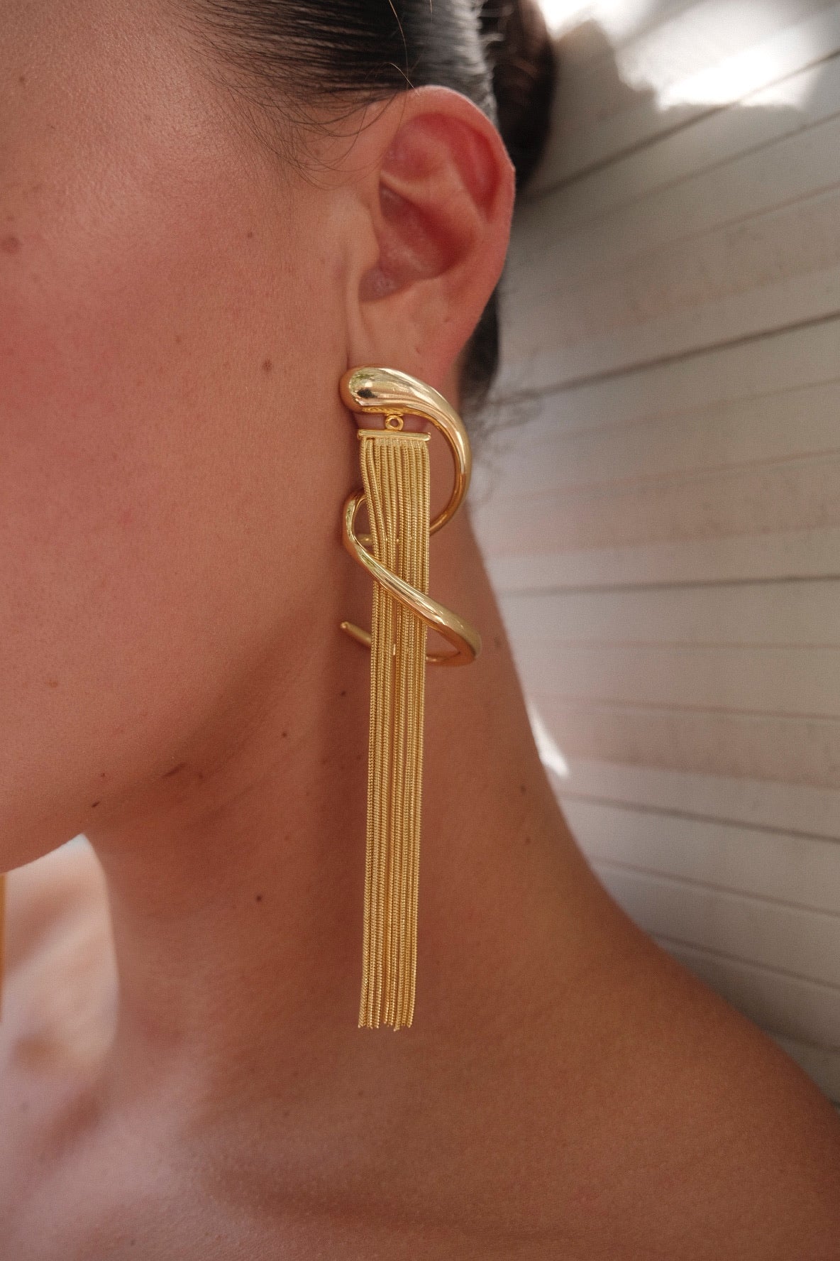 A poetic interpretation that merges organic metal and liquid references to express lightness and modernity. The elongated design features asymmetrical curves and a removable metal fringe that dances with movement.