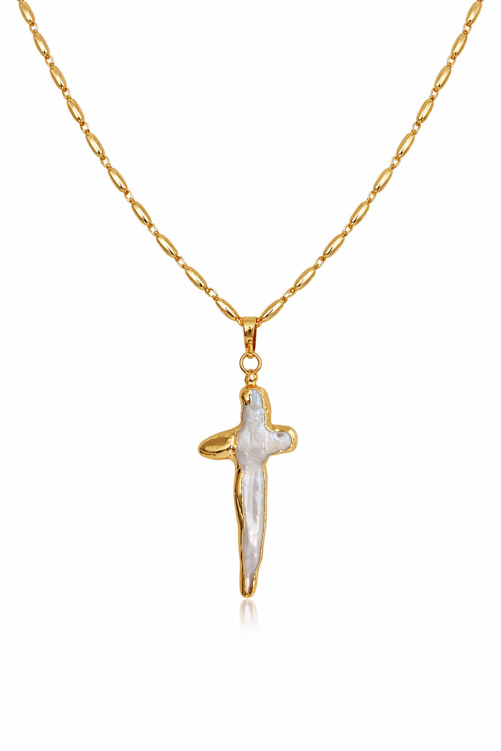 LUZ DE FE features a natural mother of pearl shaped into an organic cross silhouette, framed in polished 18k gold. Each pearl carries its own unique texture and iridescence, making every piece one-of-a-kind — just like the woman who wears it.
