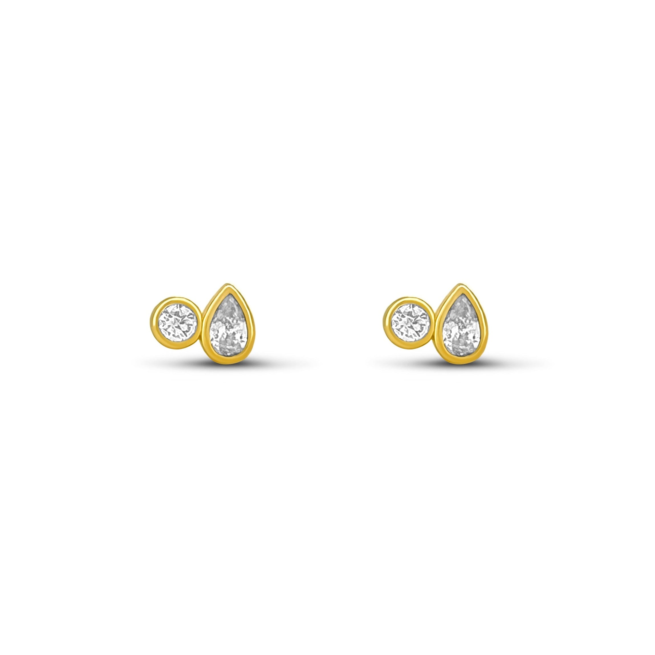 A study in balance. The pear stone reflects softness and movement; the round stone brings precision and light. Together, they create a minimal statement that sits close to the ear and speaks in subtle tones. Finished in high-quality 18K gold plating over a durable brass base.