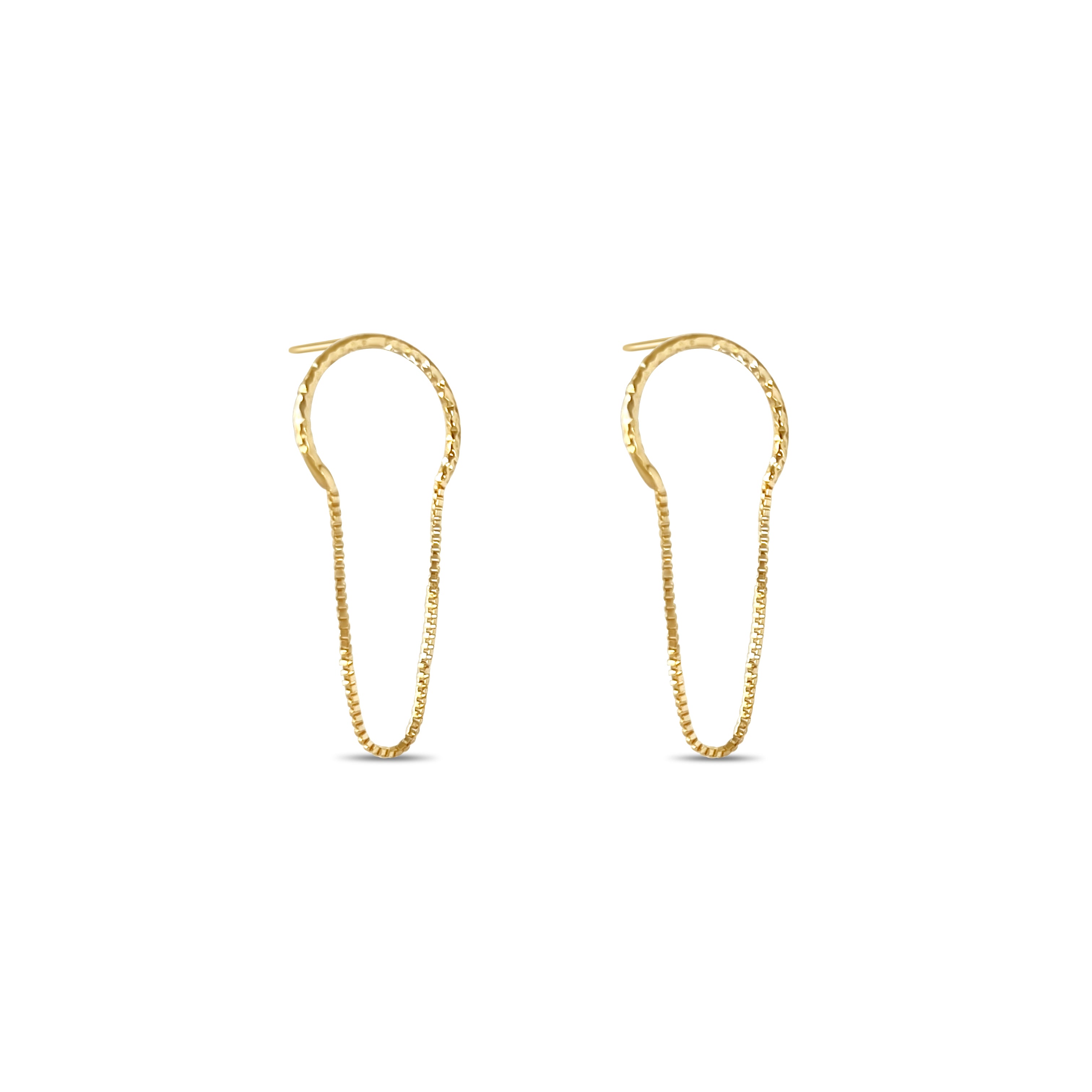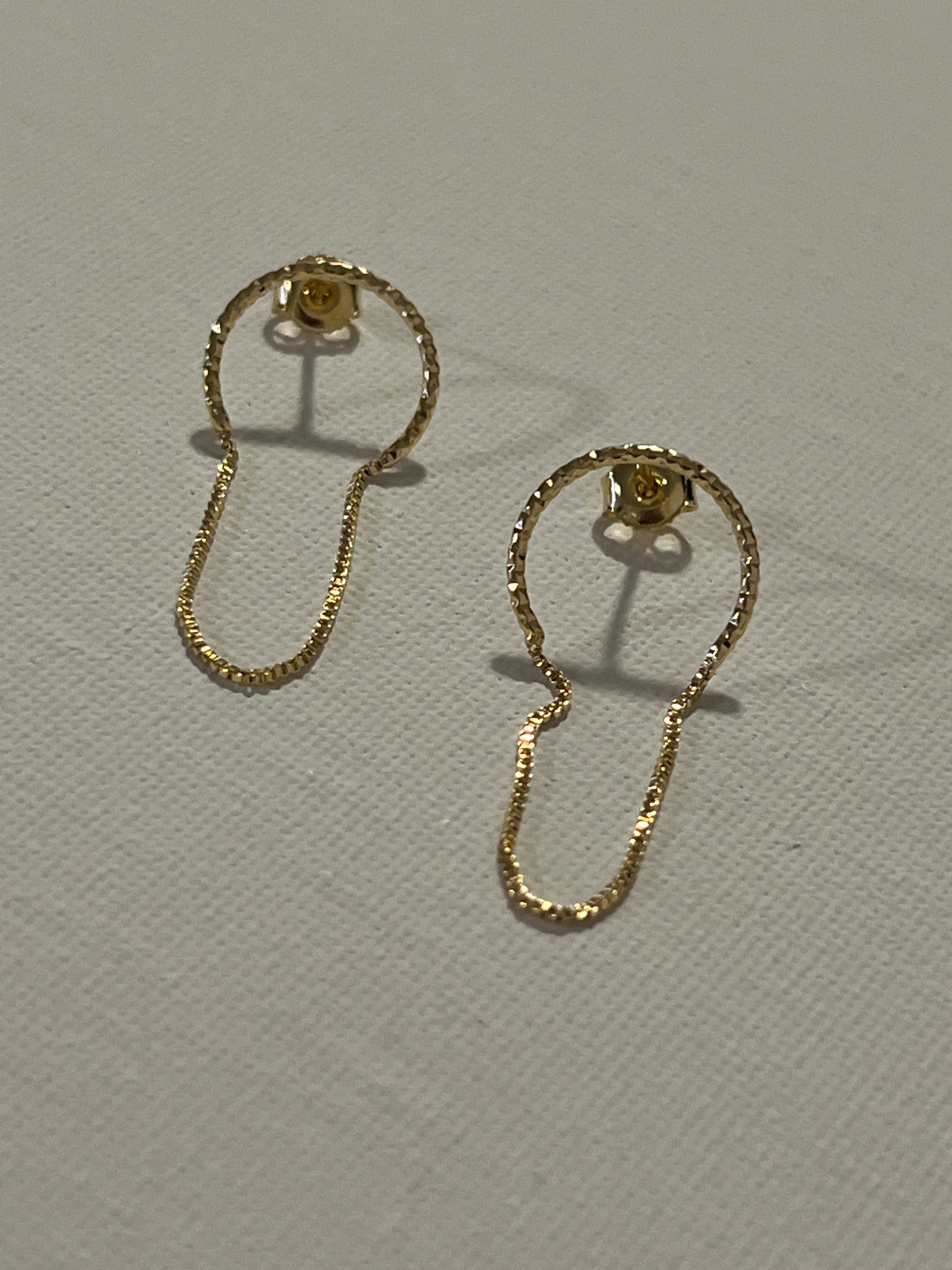 These gold earrings feature a unique open hoop silhouette with a refined chain detail that effortlessly blends minimalism with sophistication. Perfect for elevating any look, from everyday wear to special occasions. Crafted with precision to shine as a statement or complement your favorite pieces.