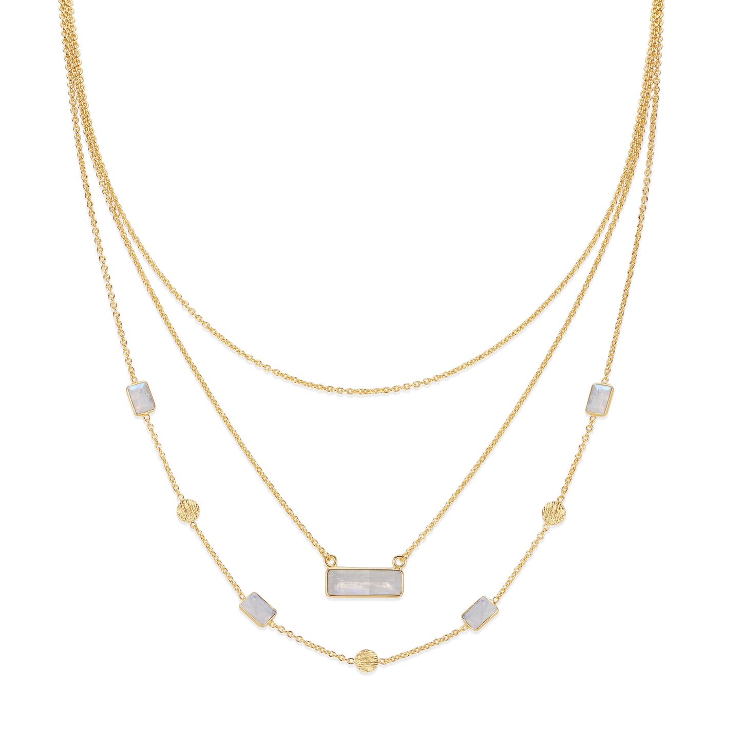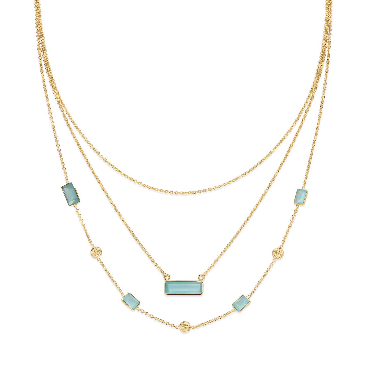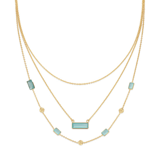 Three layers of effortless elegance in one. The Calix Necklace is designed to bring harmonious balance, adorned with delicate gemstones that catch the light just right, adding a subtle touch of magic to any look.